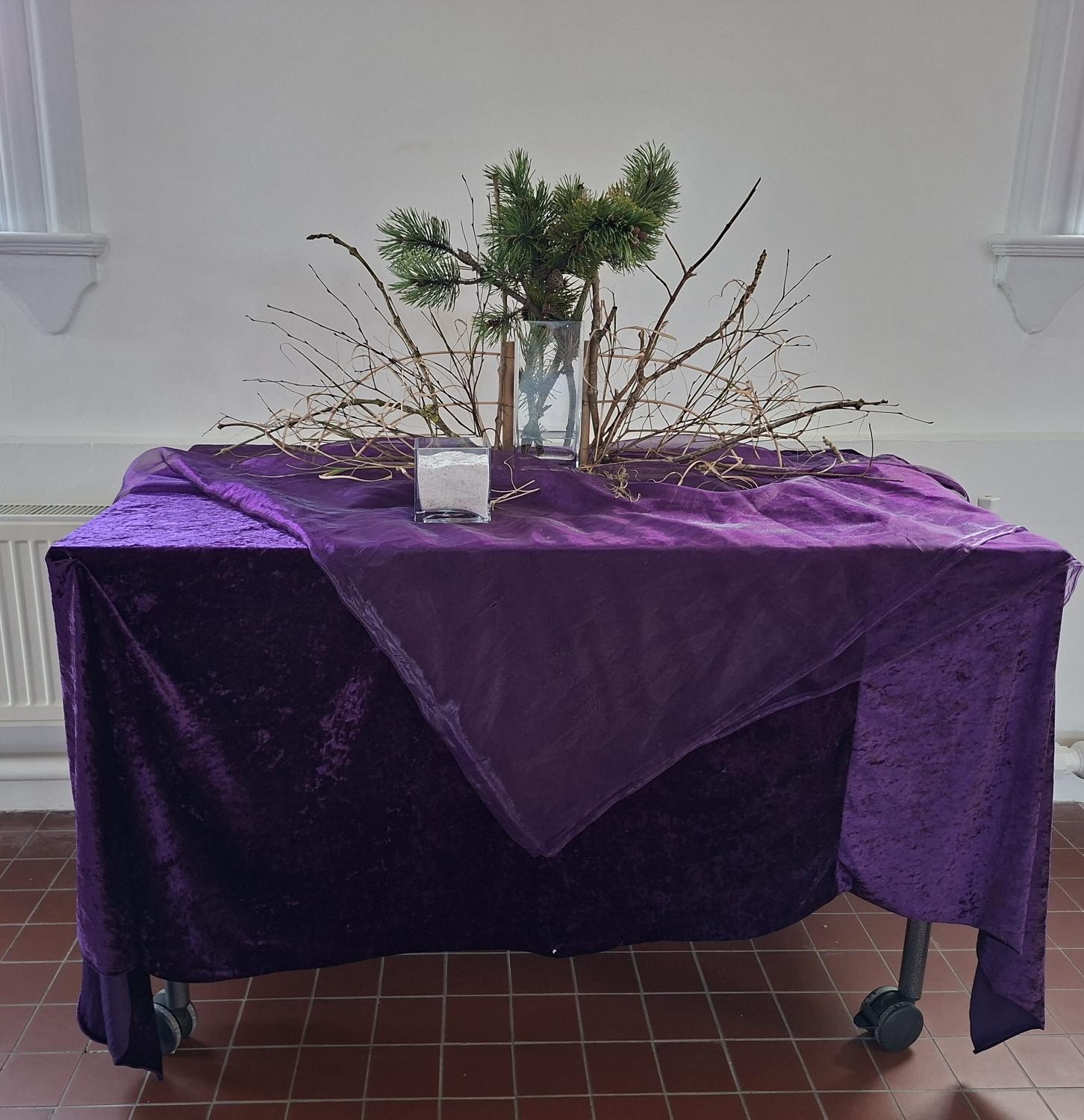 ![]() Deze zondag starten we onze weg. In de Ankerdienst volgen we een (on)bekende weg met als leidraad de lezing – Ruth 1: 1-19. Ruth die er voor kiest om samen met Naomi verder te gaan naar Bethlehem. De kinderen gaan ook op reis. Zij krijgen hiervoor een reisgids en volgen hiermee vandaag de weg van Jezus naar de woestijn – Matteüs 4: 1-11 Jezus in de woestijn. Op de tafel ligt het paarse kleed, de kleur van bezinning en voorbereiding. Hierop staat de waaiervormige schikking. In de grote vaas staan Pinus takken. De Pinus is een pijnboom. Hiermee wordt het verdriet van Ruth en Naomi aangegeven. In de vaas voor de waaier zit zand als symbool voor het zand in de woestijn uit het verhaal van de kinderen. Zij mogen de reisgids van het project bij de schikking leggen. ![]() | ||