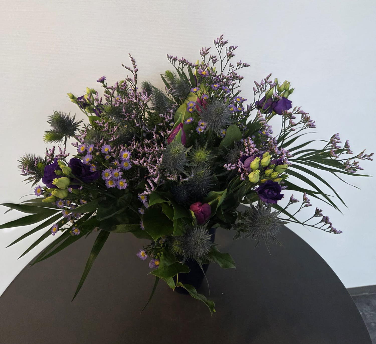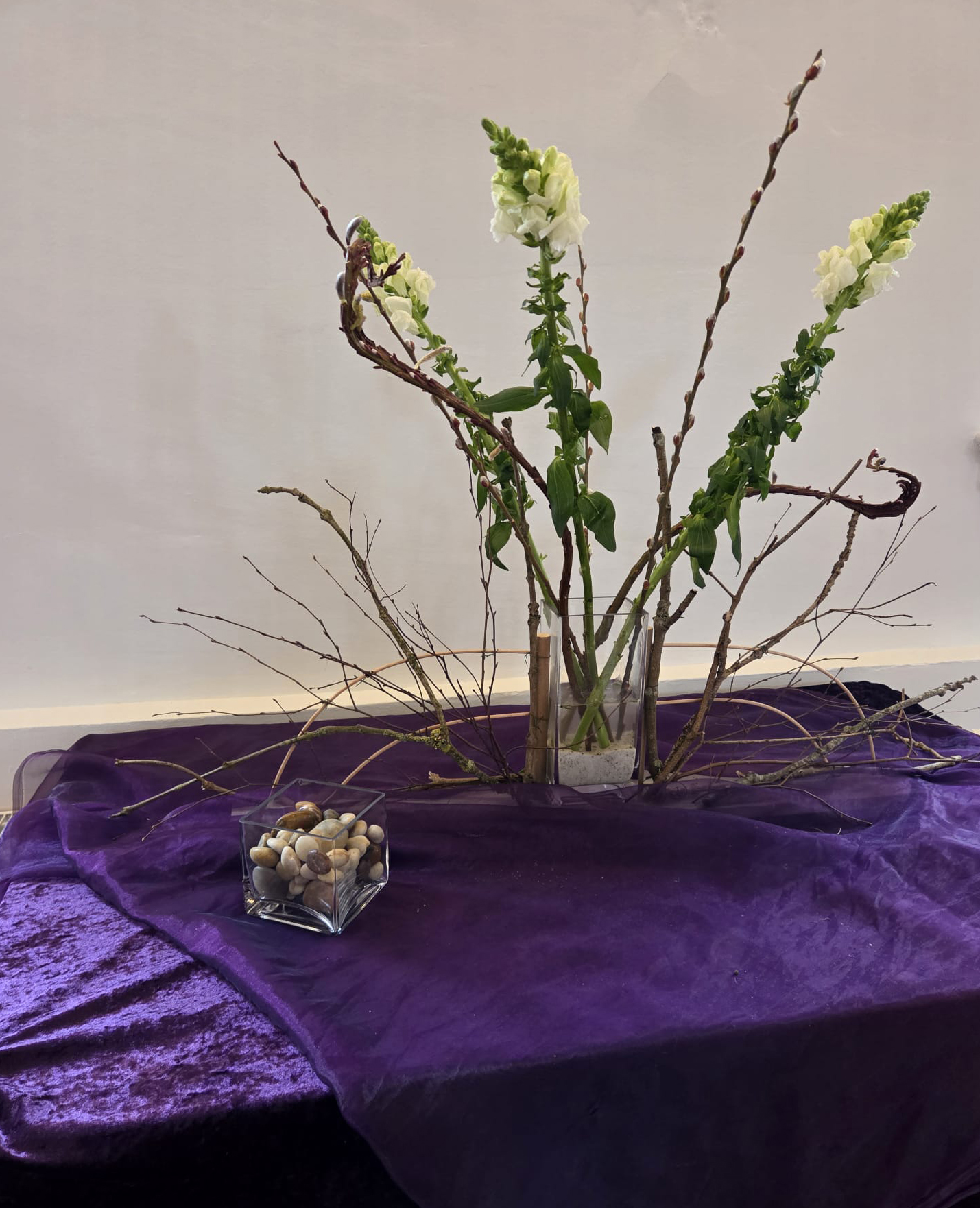 ![]() Lezing dienst: Exodus 24 vers 12 t/m 18 en Matteus 17:1-9 Ook bij de kindernevendienst wordt uit Matteus 17:1-9 gelezen Jezus nam Petrus, Jakobus en diens broer Johannes met zich mee een hoge berg op. Ze ontmoeten twee grote profeten. Mozes en Elia gingen in gesprek met Jezus. Ze hebben vast en zeker gesproken over de weg van Jezus. Vermoedelijk hebben Mozes en Elia Jezus ondersteund in het kiezen van zijn bestemming. Deze verschijning zien we terug in de drie witte bloemen. Deze schikking richt zich niet op de profeten op de berg maar op de metgezellen van Jezus. De grote vaas is gevuld met water, bloemen en wilgentakken. . De witte bloemen staan symbool voor onschuld en zuiverheid; de intenties van de drie metgezellen waren goed. De bandwilg wordt geassocieerd met groeien en vertrouwen. Een wilgentak die je in de grond steekt groeit in korte tijd uit tot een boom. In de kleine vaas is gevuld met stenen. Zo benadrukken ze de berg evenals het zand in de grote vaas. Het kleed over de tafel blijft paars. ![]() | ||