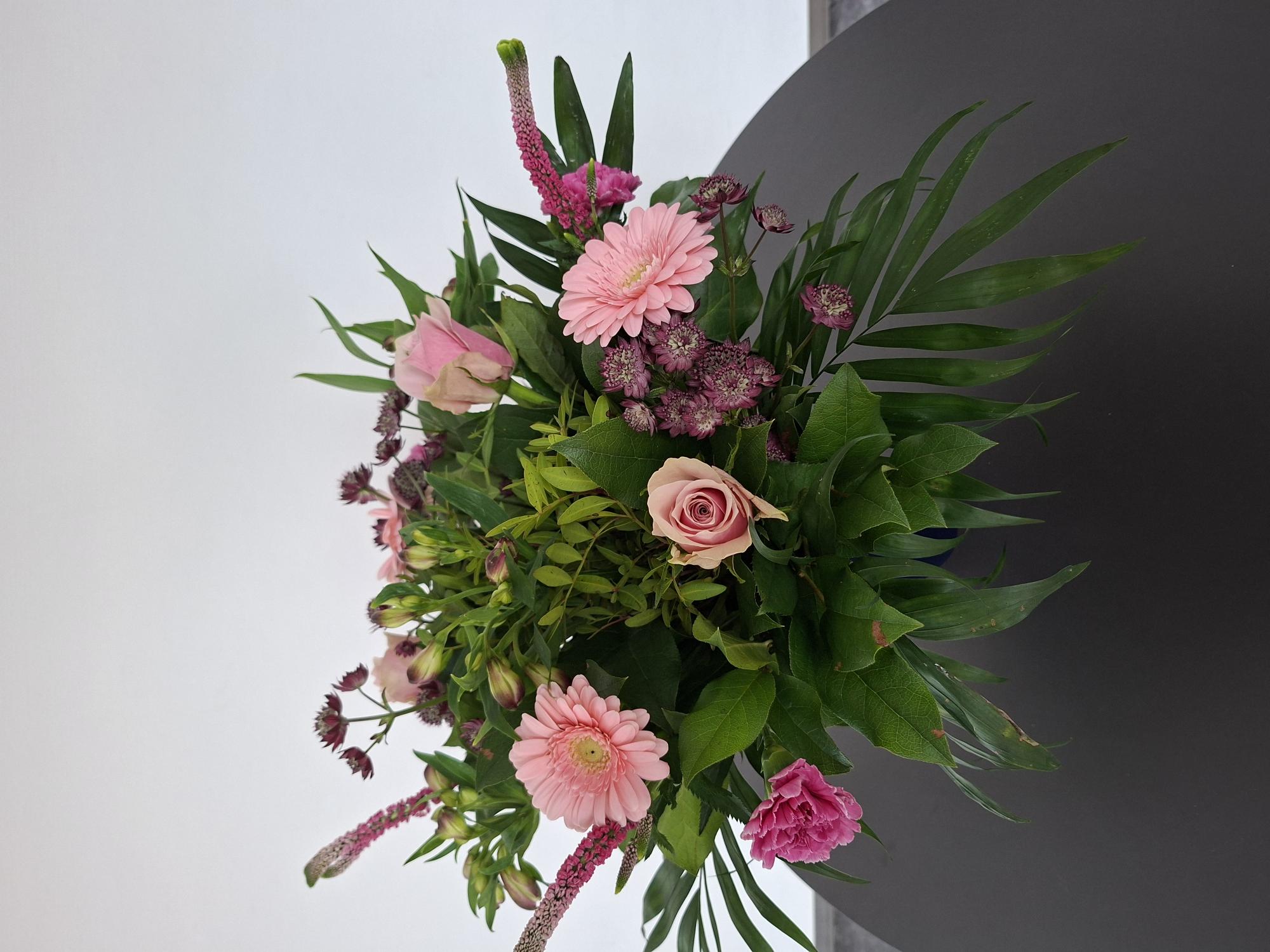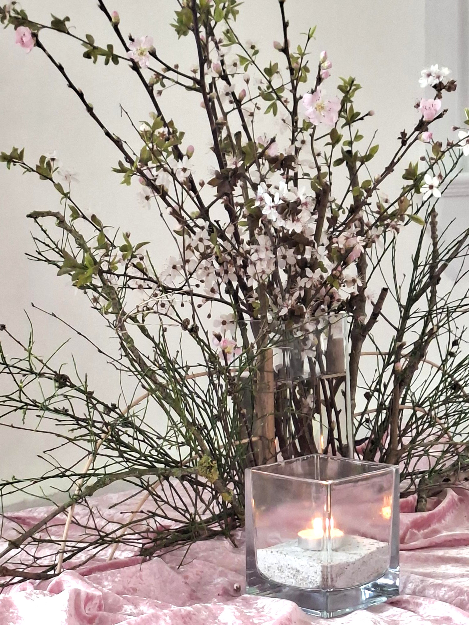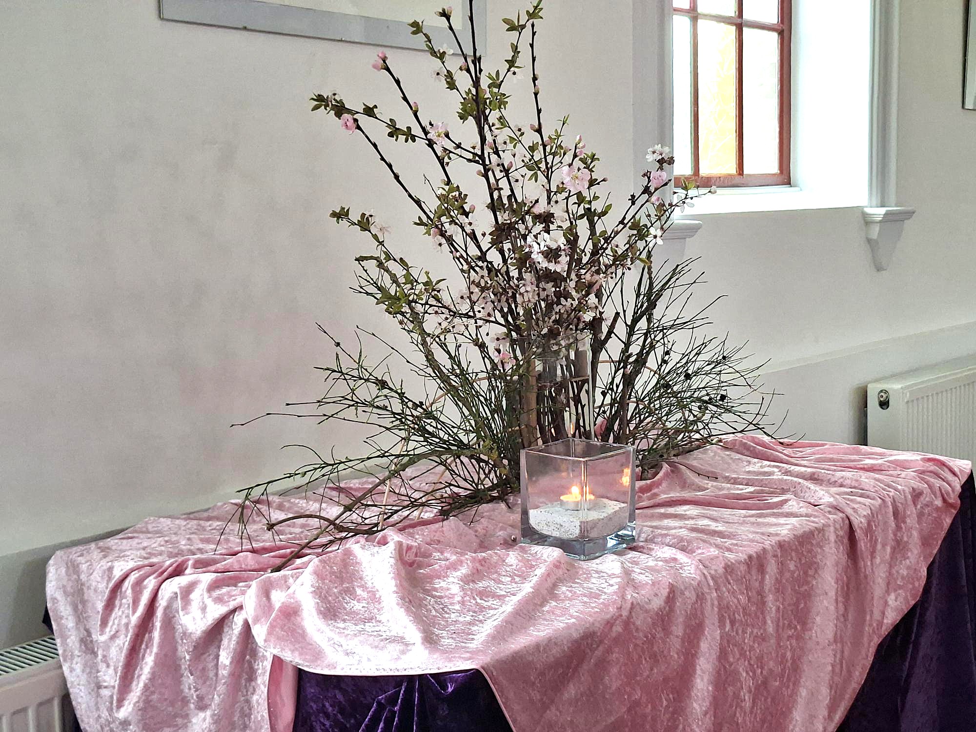 ![]() ![]() Bij de kindernevendienst wordt uit Johannes 9: 1-14 gelezen (Jezus geneest de blinde man) Lezing dienst: 1 Samuel 16: 1-13 en Johannes 9: 1-17 en 24-38. In beide diensten wordt vandaag hetzelfde verhaal gelezen: ‘De genezing van de blinde man’. Omdat hij vertrouwde in de opdracht van Jezus kon hij, nadat hij zich gewassen had, weer zien. Zijn vertrouwen was zo groot dat het hem niet kon schelen dat het op Sabbat gebeurde. Hij getuigde dat Jezus hem had genezen. Laten wij in onze rationeel ingestelde tijd het onmogelijke voor mogelijk blijven houden. De Heilige Geest waaiert breed uit, binnen en buiten de kerk. In de grote vaas staan takken met bloesem. Zij maken verbinding met de waaier. Veel bloesems zijn familie van de roos, een vijftallige bloem. Het getal 5 is het getal van de mens met zijn 5 zintuigen. Met die zintuigen kunnen we o.a. voelen, horen en zien. Bloesems zijn bedoeld om vrucht te dragen, zoals het werk van de Geest vrucht kan dragen. In de kleine vaas is een witte kaars geplaatst, teken voor het licht van de mens. Op de tafel ligt over het paarse kleed een roze kleed als teken dat het licht van het op handen zijnde feest al doorbreekt en het roze voor even voor een groot deel de plaats inneemt van het paars. Daarom is dit keer de kleur van de bos bloemen ook roze. ![]() ![]() | ||