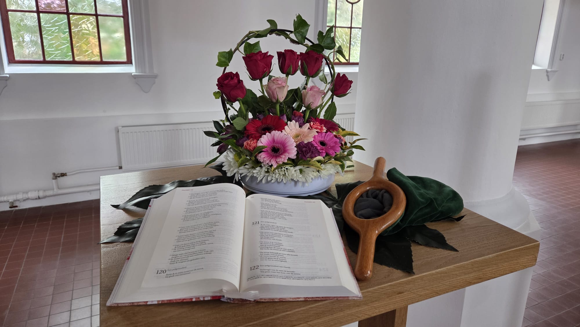 Op het rode kleed, de kleur van de Heilige Geest, liggen een collectezak en een Bijbel. De symbolen voor ambtsdragers.
