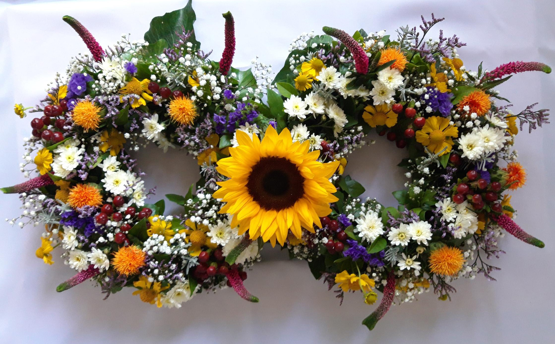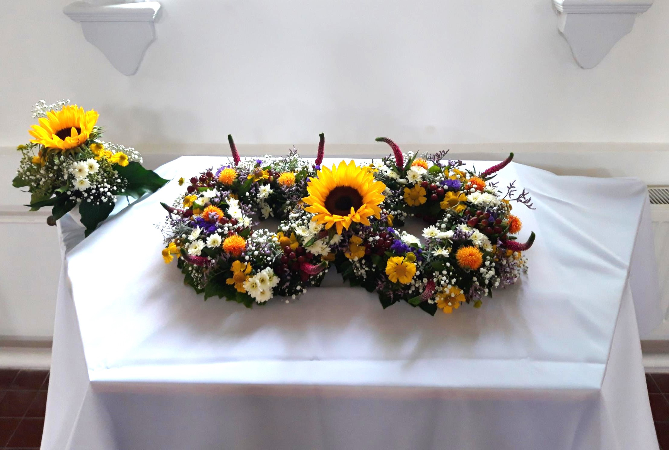 In de schikking is de Lemniscaat uitgewerkt met witte en met gekleurde bloemen. De witte bloemen dragen de kleur van de vrede, de bloemen ‘rijgen’ zich door de andere kleuren heen als een oneindig koord. Werken aan vrede betekent werken aan een continue stroom van aandacht voor de verschillen in cultuur en religie die er tussen mensen bestaan. De gekleurde bloemen vertegenwoordigen die verschillende culturen en religies. Verbinding in harmonie Werken aan de eeuwigheid – zoekend en tastend – verbinding maken met God en met elkaar, is proberen een respectvolle balans en harmonie te vinden. In het midden van de Lemniscaat kruisen de lijnen elkaar. De zonnebloem staat juist op die plaats omdat de bloem symbool is van licht en energie. De bloem met zijn vele zaden laat ook de cyclus van het leven zien. Vandaag zien we het begin van die cyclus bij Logan van Dijk die de Heilige doop mag ontvangen. ![]() | ||