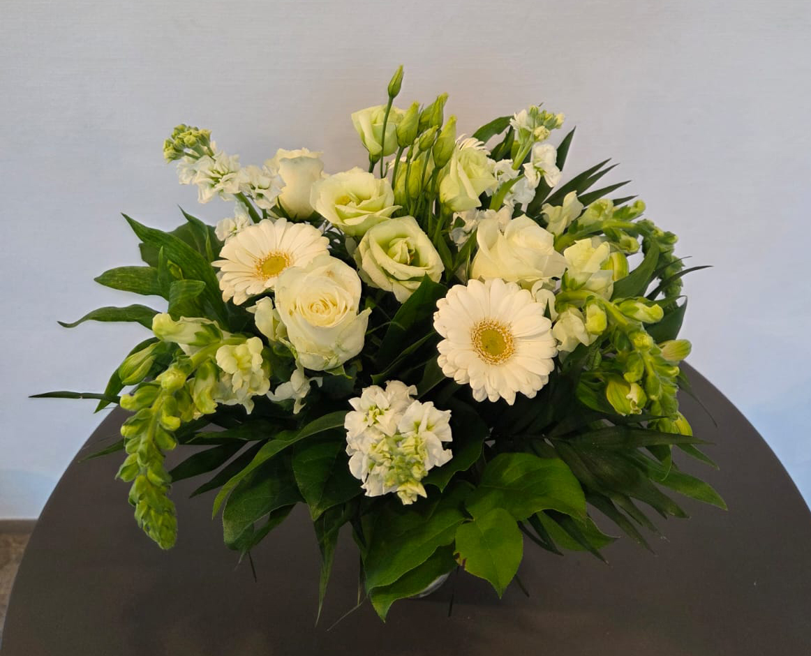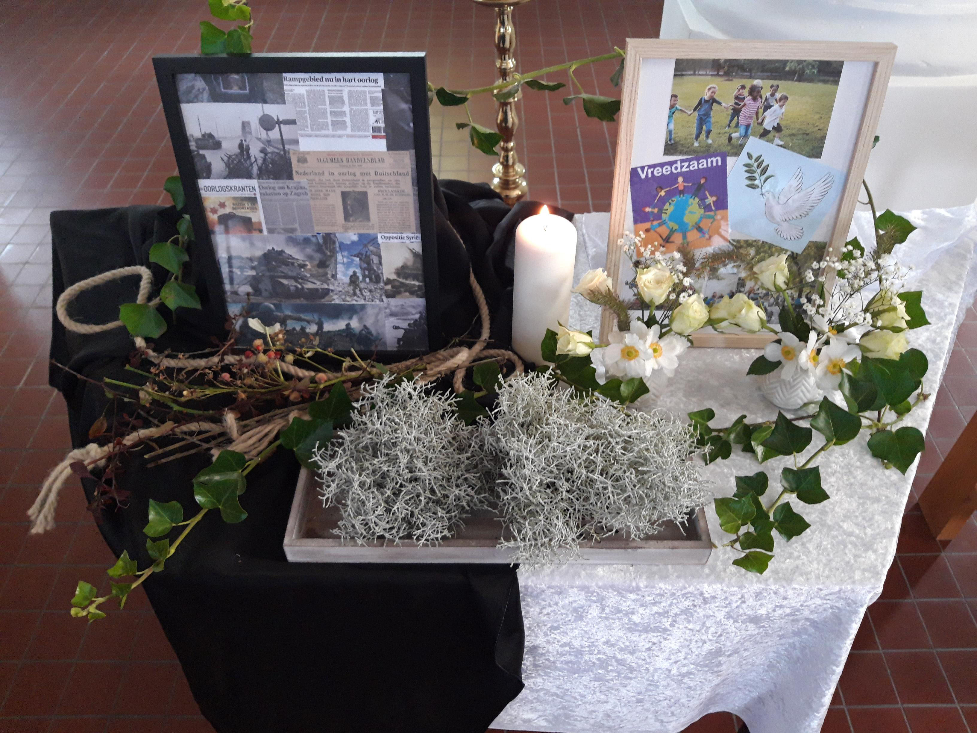 ![]() Thema: macht en onmacht Op tafel staan twee lijsten met foto’s. In de ene lijst ziet u afbeeldingen van oorlogs- en onderdrukkings-situaties. In de andere lijst zijn vredesbeelden geplaatst. Voor de linker lijst staat een schikking van dorre, donkere dingen en stekelige planten, voor de rechterlijst zijn witte bloemen geplaatst. Maar waar is nu de macht en waar de onmacht? De zilverkleurige plantjes ervoor geven aan dat niet geld of macht vrede geeft. Het geheel is gekoppeld met Hedera die ons eraan herinnert om trouw te zijn aan de Schepper. Tussen beide lijsten in staat een brandende kaars. Deze laat zien dat het licht het donker overwint, zoals het Vredeskind heeft beloofd. ![]() | ||