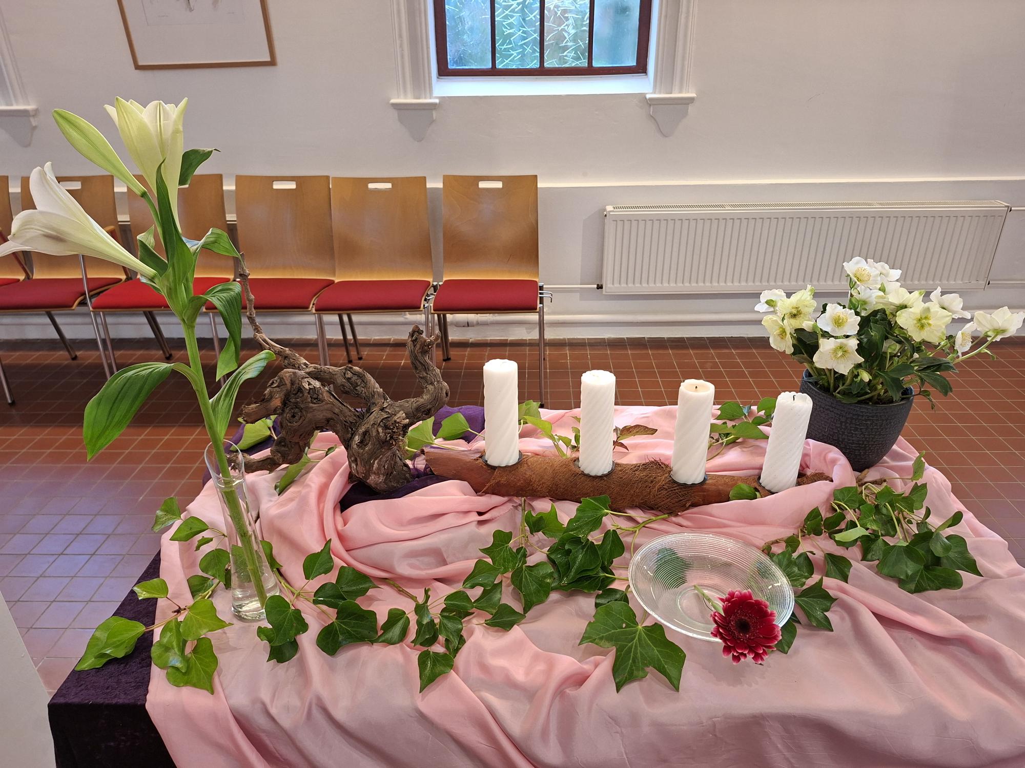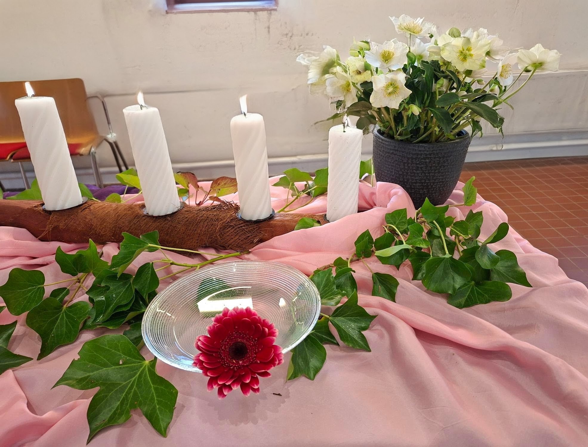 Derde zondag van Advent: 14-12-2025 ![]() Thema voor de kinderen: Jesaja 35: 1-10: Zie je het voor je? Thema van de dienst: Daniel 10: 1-21 De lezing van de kinderen uit Jesaja is een profetie over Gods belofte van een toekomstige hersteltijd, waarin de woestijn bloeit als een tuin, de zwakken weer kracht krijgen, de angst verdwijnt en vrede zal komen. De lezing uit Daniel beschrijft een visioen van Daniel waarin hij een verschijning ziet, een man in linnen gekleed, die de boodschap heeft dat hij niet bang hoeft te zijn. Hij zal inzicht geven in wat er aan het eind der tijden met zijn volk zal gebeuren. Dit visioen is dus, evenals de profetie van Jesaja, een voorspelling van de toekomst. Daarom staan er nu bij de schikking een kom met water als teken van het water dat in de woestijn zal vloeien en een helleborus als symbool van hoop, vernieuwing en vrede. De witte lelie staat symbool voor de verschijning die Daniel ziet en die benoemd wordt als engel. De kinderen leggen er nog een bloem bij de schikking als symboliek van de bloeiende woestijn. Het boeket en een deel van het kleed zijn deze derde advents dag roze als teken van de vreugde, dat Jezus geboorte bijna daar is. ![]() ![]() ![]() | ||