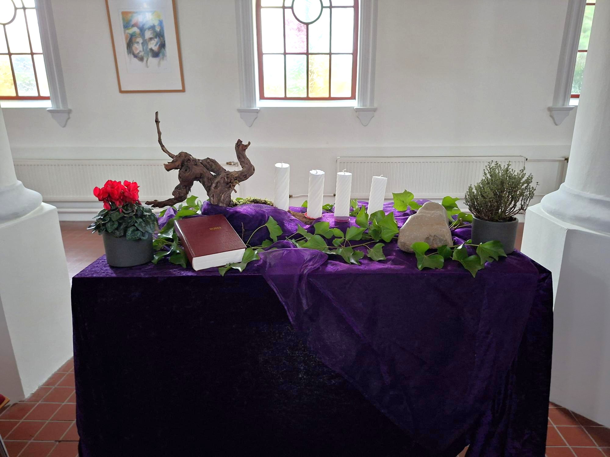 ![]() Uitleg liturgische schikking eerste advent De liturgische schikking voor de komende adventsdagen en kerst heeft een basis van een verticale – (onze verwachting komt van boven) en een horizontale tak geplaatst (wij weten ons gedragen). Op de horizontale tak staan 4 kaarsen. Elke zondag zal er één kaars meer aangestoken worden. Op de tafel ligt een paars kleed ten teken van bezinning en voorbereiding. | ||