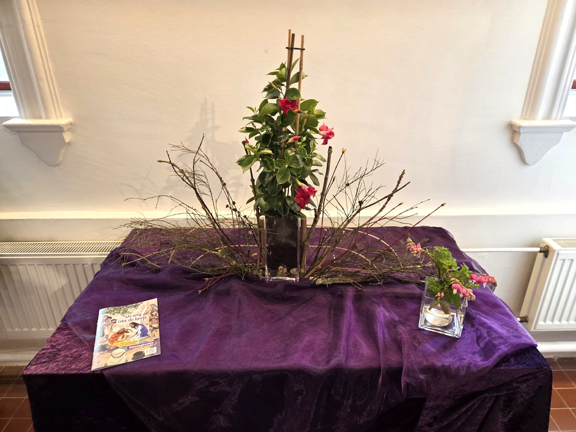 ![]() Uitleg liturgische schikking Goede Vrijdag, 18-04-2025 Vanavond lezen we psalm 22 en Lukas 23: 32-49 Wij herdenken dat Jezus voor ons aan het kruis is gestorven. Veracht door de mensen en verlaten door zijn vrienden. Daarom staat op de 5e tree van de trap het kruis. Het staat eenzaam op de trap zoals ook Jezus eenzaam was. Onder het kruis staan vaasjes met rode ranonkels. Zij symboliseren het lijden. Rood, de kleur van pijn en verdriet. | ||