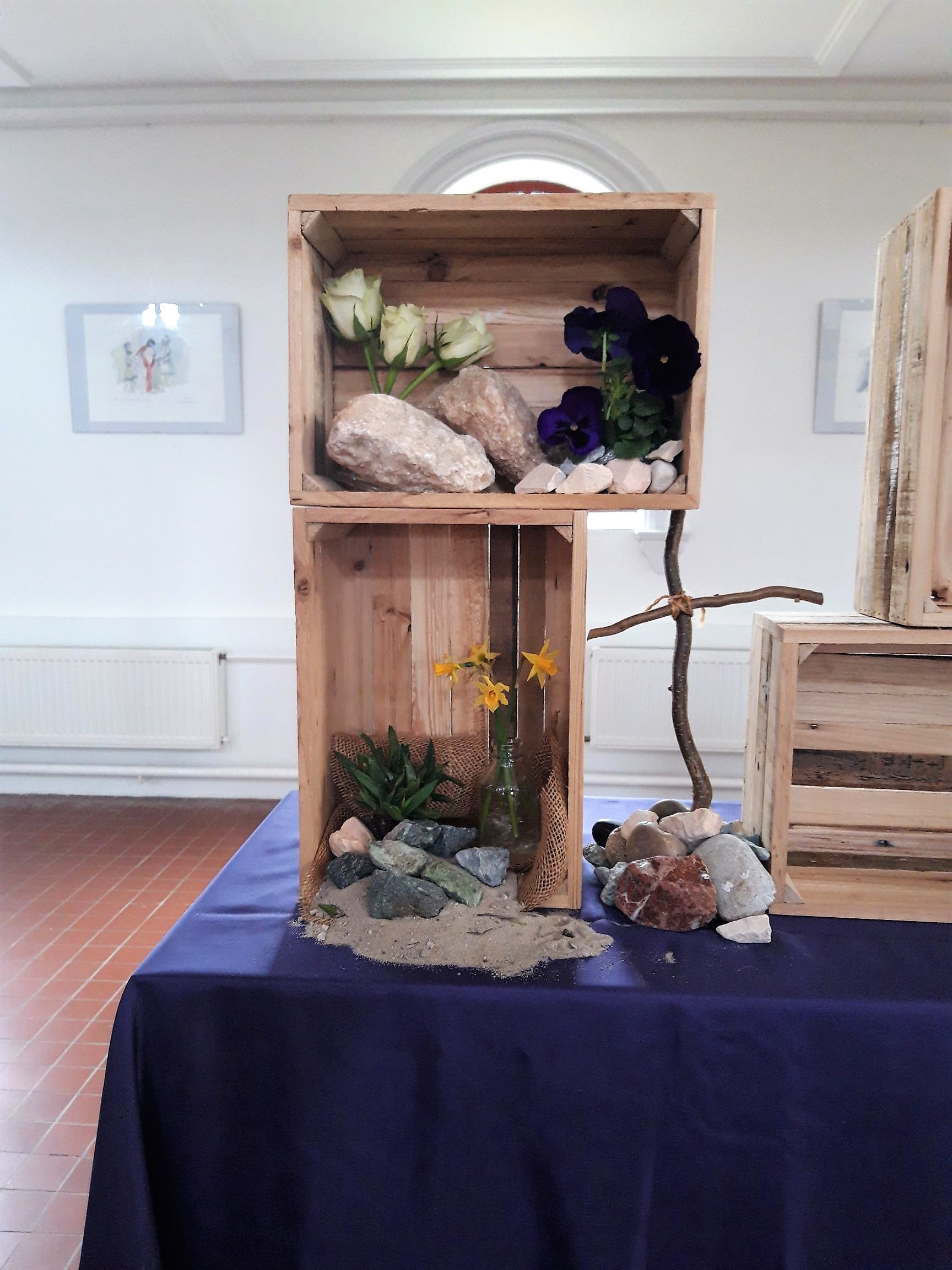 ![]() Uitleg 2e zondag 40 dagen tijd. (Marcus 9: 2-10) Jezus gaat met drie van zijn leerlingen de berg op. Op de berg is er een bijzondere ervaring en ontmoeting met Mozes en Elia die ze vast willen houden. Deze verschijning en de verandering van Jezus zien we terug in de drie witte bloemen. De drie paarse bloemen staan voor de drie leerlingen en bezinning. Wat er gezien is op de berg is niet vast te houden maar wel mee te nemen in het denken en doen. "Sta in je kracht